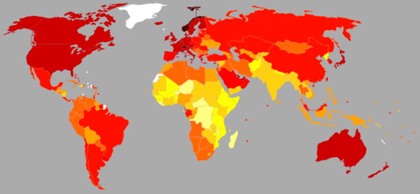 2015年、1人当たり名目GDPを示した世界地図(参照Wikipedia)