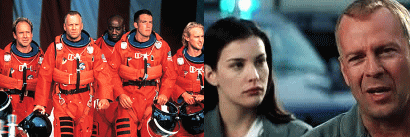 | 作家志望の夢を抱いてローマに出た青年マルチェロ・ルビーニ(マルチェロ・マストロヤンニ)は、今は社交界ゴシップ専門のトップ屋となった。憧れた都は退廃と無気力以外の何ものでもなかった。カトリックもキリストの像をヘリコプターで運ぶなど、華やかな示威をした。豪華なナイトクラブでは、ローマの大富豪の娘マッダレーナ(アヌーク・エーメ)にめぐり会った。場末の夜の女の宿でマルチェロと一夜をすごすことも、彼女にとってはほんの気まぐれだった。郊外のわびしい家に帰った時、マルチェロは同棲中の愛人エンマが服毒して苦しんでいるのを見た。しかし悔いる気持も永くは続かなかった。彼はハリウッドのグラマー女優(アニタ・エクバーグ)を迎えると、野外で狂乱の宵を過し、名所トレーヴィの泉で戯れた。ローマ地方の郊外で奇蹟が起きた。再び聖母出現の日の聖地はテレビ・カメラに包囲され、奇蹟にあやかろうと横たわる病人の上に豪雨が降りそそいだ。日頃マルチェロのため悩みの絶えぬエンマは熱狂して信じた。二人は友人スタイナー(アラン・キュニー)の家を訪れ、調和と安らぎに満ちたその生活を羨んだ。或る夜、豪壮な館のパーティーに出たマルチェロは、虚脱したように歓楽をむさぼる貴族たちの仲間入りをした。スタイナーは死んだ。子供を連れた無理心中だった。平和に見えた一家のこの悲劇の深さはマルチェロの残った夢をすべて消した。その場限りの快楽の他に今の彼は何を望んだろう。やがて海に近い別荘でこの世のものとも思えぬ乱痴気騒ぎの狂宴がくりひろげられた。マルチェロは自ら狂乱の中に没入した。夜明け方、人々は快楽に疲れ果てた体をひきずって海辺に出た。波打ち際に打ち上げられた怪魚は、腐敗し悪臭を放ち、彼らの姿そのものだった。彼方から顔みしりの少女ヴァレリアが何か叫んでいる。その声は波に消されて彼の耳には入らない。真実の生命の清純さに溢れる少女に背を向けて、マルチェロは砂浜を別荘の方へと戻って行った。 | テキサス州に匹敵する大きさを持つ巨大なアステロイド(小惑星)が地球に接近、ニューヨークが無数の隕石群に包まれた。計算の結果、18日後には地球に衝突することが発覚。人類滅亡を回避すべく、NASA 総指揮官トルーマン(ビリー・ボブ・ソーントン)は、小惑星の表面に穴を開け、地中で核爆弾を爆発させれば軌道 を変えることができるという案を聞き、石油採掘のプロ、ハリー(ブルース・ウィリス)に惑星上での掘削を依頼する。ハリーは長年共に仕事をしてきたチック(ウィル・パットン)、ロックハウンド(スティーヴ・ブシェーミ)、ハリーの娘のグレース(リヴ・タイラー)の恋人のA.J.(ベン・アフレック)らを呼びよせる。彼らは厳しい訓練のあと、二機のシャトルに乗り込み惑星に向かうが、A.J.の乗った「インディペンデンス号」は着陸に失敗。ハリーたちは単独で掘削作業に取り掛かるが、作業は困難の極みだった。だが、死んだと思っていたA.J.たちが掘削機に乗って駆けつけ、ハリーと共に掘削を成功させる。喜びもつかの間、誰かが核を手動で爆発させなければならないことがわかる。クジで当たったA.J.が残ることに決まったが、ハリーはA.J.を無理矢理シャトルに乗せ、「お前は自慢の娘婿だ」と言い残して掘削現場に戻り、核のボタンを押す。自らを犠牲にしたハリーの行為により、惑星は軌道を反れ、地球は救われるのだった。 |