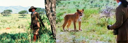 一九一四年、欧州で戦乱が起った頃、アフリカのドイツ領コンゴでは、ドイツ軍が村の掠奪を行い、宣教師はそのショックで死んでしまった。彼の妹ローズ・セイヤア(K・ヘプバーン)は天涯孤独の身となった処を、カナダ生れの飲んだくれ男チャリイ・オルナット(H・ボガート)に引き取られた。チャリイは村々に食糧や郵便をくばる川蒸気「アフリカの女王」号を操っていたが戦争の終るまで仕事をやめて引こもろうと決心した。しかしローズは、川を下って下流の湖に碇泊しているドイツ砲艦「ルイザ」に近づき、舟もろとも魚雷をぶつけて撃沈しようと言い張った。やっとみこしをあげたチャリィは、彼女と共に川を下りはじめたが、雨が降っても彼女の居る被いの中には入れて貰えず、秘蔵のジンは川に捨てられてしまう始末だった。やがて舟はドイツ砲台の前を通過、エンジンをこわされ、やっと逃れると激流にはまって矢のように岩の間を滑り出した。エンジンが直った時二人は思わずキスし、以後、曲ったスクリュウを一週間もかかって叩き直したり、マラリアにおかされたチャリイをローズが必死に看護したりする苦労を重ねて、ようやく湖にすべりこんだ。二人はひそかに舟に魚雷をとりつけ、夜と共に「ルイザ」に向け突進したが、波が高く寸前で転覆、沈没してしまった。二人は「ルイザ」に捕われ、スパイとして絞首刑を宣告されたが、チャリイは執行前にローズとの結婚式をあげさせてくれと頼み、許されて二人の式が行われている時、突如「ルイザ」は大爆発を起した。沈んでいた「アフリカの女王」に乗上げたのでもあろうか。チャリイとローズは、意気揚々岸へ泳ぎはじめた。 |