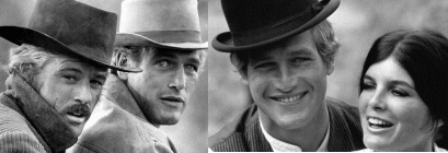 | 1890年代の西部。家畜泥棒と銀行強盗が稼業の2人組のガンマン、ブッチ・キャシディ(ポール・ニューマン)とサンダンス・キッド(ロバート・レッドフォード)は、同じ盗人仲間のハーベイ・ローガン(テッド・キャシディ)らの誘いにのって、列車強盗を試み、大金をせしめた。この後ブッチは、銀、錫などの鉱山資源の豊富なボリビアへ行って荒稼ぎしようと、サンダンスを誘う。そして、スペイン語のできるサンダンスのガール・フレンド、女教師のエッタ(キャサリン・ロス)も交えて、彼らはボリビアへ向かう。が、ボリビアはブッチの想像とは異なり大変な貧乏国で、2人はたちまち銀行強盗に戻る。やがて2人はヤンキー泥棒として有名になり、警察も彼らに手ごころを加えた。2人にとってはこれが不満で、とうとう彼らは足を洗い、錫山のガードマンとなった。エッタは2人がカタギになったことを喜ぶが、所詮、泥棒稼業が身についた2人、正業を長続きさせることはできないだろうと考えていた。この不安は的中し、数年後、彼らは鉱山の給料を奪い、再び警官に追われる身となった。捜索には、ボリビア軍隊までも動員され、2人はあえない最期をとげた。 |