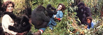 絶滅の危機に瀕しているという中央アフリカの山奥にだけ棲息するマウンテンゴリラを救うため、婚約者を米国に残し、単身アフリカに向かったダイアン・フォシー(シガニー・ウィーヴァー)をナイロビ空港で出迎えてくれたのは、彼女の協力の申し出を受け雇ってくれたリーキー博士(アイアン・クスバートソン)だった。ところが博士は、地図とジープを彼女に残すと、全てを任せると別の地へ旅立ってしまった。ダイアンは山裾の村で数人の作業員とガイドのセンバガーレ(ジョン・オミラ・ミルウィー)を雇い、内乱の国コンゴの山奥へと向かうのだった。何とかゴリラ研究家シャラーがかつて住んでいた小屋にたどりついたダイアンであったが、密林の中を歩き回るだけの日々が続き、絶望的な気持ちを抱いていたそんな6週間目のある日、ふとした偶然から彼女はついに、排泄されたばかりの糞とその近くにいた数頭のゴリラの群れを発見する。そして数日後、感動的なゴリラとの触れあいに成功したダイアンは、次第に彼らの中に溶け込んでゆき、リーキー博士宛の報告書を書く仕事も順調に進んでゆく。ところが彼女は、内乱によって突然現われた兵士たちにキャンプからの追放を命じられ、ルワンダに住む博士の友人ロズ・カー(ジュリー・ハリス)のもとに身を寄せる。絶望の思いに駆られるダイアンの心に、再び熱い勇気を与えたのはロズ・カーのアフリカをこよなく愛する心であった。ダイアンは再び山に登り、小屋を建て、カリソケ研究センターを開設するが、ある日密猟者によって5頭のゴリラが殺され、子供のゴリラが連れ去られる事件が起きた。しかし彼らは政府の役人の許可をとっており、ダイアンは不条理な憤りに胸をつまらせる。そんなある日、カメラマンのボブ(ブライアン・ブラウン)が彼女のもとを訪ねて来て、いつしか彼との深まる愛に心安らぐダイアンであったが、密猟者によって雄ゴリラのデイジットが殺されたという事件は、そんな幸せをも破壊した。冷静な科学者の姿を失い、ゴリラのことしかない彼女との結婚をあきらめたボブは、仕事のために他の地へと去ってしまった。やがて助手としてこの地にやってきた若き研究者たちの思うに任せない様に反感を露骨に現わす彼女は、いつしか人々からゴリラを愛するあまり狂ったと思われるようになる。そして85年12月、ダイアンは18年間過ごしたセンターの小屋の中で何者かによって惨殺され、その一生の幕を閉じるのだった。 |
