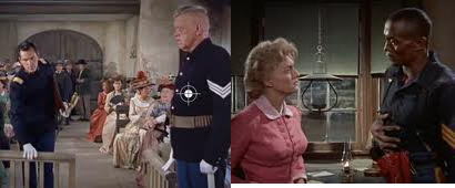 合衆国第9騎兵隊のカントレル中尉(ジェフリー・ハンター)は、南北戦争終了後、軍法会議に付された黒人兵ラトレッジ軍曹(ウッディ・ストロード)の弁護を志願した。優秀な軍歴を誇っていたラトレッジは16歳になるルーシイを強姦、絞殺した上、彼女の父であるダブニイ少佐を射殺した嫌疑によって告訴されていた。最初の証人としてカントレルの恋人メアリー(コンスタンス・タワーズ)が脱走したラトレッジに命を救われたと証言した。砦の軍医エックナーの報告によるとルーシイの死体から黄金の十字架がなくなっており、推定によればダブニイ少佐が娘の襲われている現場を見て、助けようとした途端に犯人に射たれたということだった。カントレルが証言台に立った。彼はインディアンを阻止するために偵察隊を率いて出動しその途中でラトレッジを捕らえたのだ。彼は被害者が死んでしまった以上、黒人兵が何を言っても信じないだろうとだけ打ち明けた。やがて偵察隊はインディアンの手にかかったクリス・ハブルの惨殺体を見つけた。彼は雑貨店の主人チャンドラ・ハブルの息子だった。偵察隊はアパッチに奇襲され、手錠をはずしてもらったラトレッジは大活躍し何度も中尉の命を救った。だが銃を手にしたラトレッジは突然逃げ出した。逃げのびたラトレッジはインディアンのわなを発見し偵察隊までひき返した。インディアンの死体から十字架が発見された。明らかにルーシイの首飾りだった。そのインディアンはまたCHと刻まれているバックスキンをつけていた。これは前に惨殺されたハルブの頭文字だった。アパッチはクリスの死体から十字架を奪ったのに違いなかった。皆の疑いはクリス・ハブルに向けられ、新犯人だということになった。調査の結果、ラトレッジのアリバイも正当防衛も証明された。しかし発見されたバックスキンの上衣はクリス・ハブルの物としては、あまりにも大きく、また十字架も本当にルーシイがつけていた物かという点に疑問をもったカントレルの激しい尋問にチャンドラ・ハブルは自分の犯行を自供した。 |