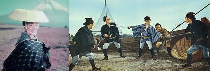 縞の合羽を海風になびかせて、三度笠、長脇差一本腰にぶちこんだ石松。逃げまどう旅鴉を追っかけて三人の渡世人が斬りつけるのを見て助太刀におよんだ。石松は大暴れの末、旅鴉を逃がしてやったが後が大変。三人の渡世人は清水一家の大政、小政に、増川の仙右衛門で、逃げた旅鴉が仙右衛門の親の仇神沢の小五郎だというのだ。石松は小五郎をさがしに船着場に日参した。ある日、船着場で盲がフクロ叩きにあっているのを目撃、石松はその盲を救けたが、これが牛若の三次という大泥棒。しかし、三次から小五郎がドモ安一家に潜んでいることを聞き出した。石松は単身ドモ安一家になぐりこみをかけた。これを聞いた次郎長一家も助太刀に出た。仙右衛門は親の仇を討った。--石松は奉納金五十両を持って四国の金比羅さんに出発した。清水を出た途端、丸亀藩の姫と家老が悪家臣に追われて逃げて来た。石松は千恵姫を救ったが、家老の田宮鉄斎は殺された。そこで三次に会い、三次は丸亀藩に注進のため一足先に出発、石松と千恵姫の二人旅が始まった。船中ではやくざ通の町人におだてられいい気分だったが、讃岐の船着楊には、千恵姫の命を狙う安藤伊十郎らの悪家臣がずらり待ちぶせしていた。石松は千恵姫をかばって大活躍したが多勢に無勢、次第に追いつめられた。と、そこへ三次が案内する丸亀藩の忠臣が駈けつけ、無事千恵姫を救った。 |