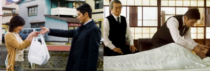 所属していたオーケストラが解散して、失業したチェロ奏者の小林大悟(本木雅弘)。やむなく彼は妻の美香(広末涼子)と二人、実家である山形へと帰った。その家は、2年前に死んだ母親が残してくれた唯一の財産だった。愛人を作った父が家を出たあと、母は女手ひとつで大悟を育ててくれたのだ。新たな職を探す大悟が行きあたったのは、佐々木(山崎努)が経営する納棺師という仕事だった。死者を彩り、最期のときを送り出すという業務の過酷さに、大悟は戸惑いを隠しきれない。しかし、佐々木と事務員の百合子(余貴美子)の持つ温もりに惹かれて、大悟は「おくりびと」となった。美香にすら、その仕事の内容を明かせないまま…。故郷に戻った大悟は、幼い頃に通っていた銭湯で同級生の母親であるツヤ子(吉行和子)との再会を果たす。銭湯を経営するツヤ子は、廃業を勧める息子たちの声も押し切って、ひたすら働き続けていた。やがて、大悟の仕事を知った美香は、我慢できずに実家へと帰る。死者を扱う夫の業務が、どうしても納得できなかったのだ。それでも大悟は、納棺師を辞められない。唐突に倒れて、この世を去ったツヤ子の納棺も担当した。どこまでも自身の仕事に誇りを持つ大悟の気持ちを、ようやく美香も理解する。二人の関係は修復した。そんなとき、父の訃報が大悟のもとに届く。家庭を捨てた父親には深いわだかまりを抱いていた大悟だが、佐々木や百合子からの説得を受けて、死去した老人ホームへ美香と向かう。そこには、30年ぶりに対面する父(峰岸徹)の遺体があった。そして父が、決して大悟のことを忘れていなかったことを知る。堪えきれずに嗚咽する大悟の涙を、美香はハンカチで拭く。父の納棺を慎ましく行う大悟と、それを見守る美香。彼女の胎内では、大悟との間で芽生えた新たな命が動いていた。 | ||||||||||||||||||||||||||||