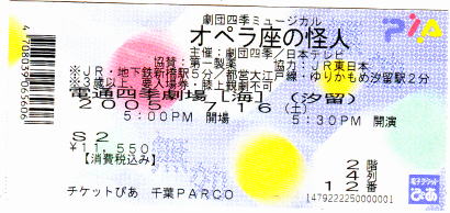 | 劇団四季「オペラ座の怪人」東京公演 電通四季劇場[海] 2005年1月12日〜2007年3月21日 出演者 メイン3役 オペラ座の怪人:高井 治 クリスティーヌ:佐渡寧子 ラウル:石丸幹二 準メイン カルロッタ:種子島美樹 メグ・ジリー:荒井香織 マダム・ジリー:秋山知子 ムッシュー・:アンドレ:林 和男 ムッシュー・フィルマン:青木 朗 ピアンジ:半場俊一郎 ブケー:寺田真実 男性アンサンブル:1〜9枠 女性アンサンブル:1〜12枠 ![]() |