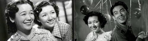| 落語家の新笑は、いまは引退して妻のおだいと、子供とささやかな生活を営んでいたそこへ居候として入ってきたのが、新笑が昔世話になったという恩人の娘お秋と、お秋の友人のお春だった。二人の明朗な娘達は朝から歌をうたって、おだいをイライラさせる。新笑の甥の武助は、会社の合唱隊を組織して歌に精進しているし、お春は声楽家、お秋は画家と、いずれも芸術家としての意欲にもえていた。しかし一文なしの娘達には、絵の具もピアノも買うことは出来ず、そうかといってブラブラといつまでも遊んでいる訳にも行かなかった。お秋が職さがしに出かけようとすると、おだいにポチを捨ててきてくれと頼まれてしまった。ポチをつれたお秋が捨場に迷っているとある映画会社のロケ隊に出会った。しかもその撮影に是非ポチと一しょに出てくれという話になり、一日だけエキストラとしてキャメラの前に立つことになった。撮影は進行して、女優の山田美恵が池の中に放り込まれることになって、ハタと困ってしまった。というのは山田嬢が、ガンとして承知しないのである。そこで代役を使うことになったので、お秋は早速お春をよんできて、代行させた。おかげで二人は千円という大金を手にすることが出来たのだった。そのエキストラで知り合った白井哲夫の世話で二人はバーで歌をうたうことになった。バーからバーへ毎夜銀座の裏から裏へ、白井の伴奏で三人は働いた。おかげでお秋もお春も、小ざっぱりした洋服と、いくらかの貯金も出来た。新笑の家では、生活も苦しく、しかも月一杯に十万円払い込まないと家を追いたてられると聞いて、恩返しはこの時とばかり、三人で十万円を送って新笑の苦境を救ったのだった。そのころから武助も会社をクビになったので三人の中に加って、武助とお秋、白井とお春の青春コンビは、カンカンブギウギのリズムと共に、親密さを増していった。新笑も引退しているような時代ではないと、再び落語家として第一線で活躍することになったその高座復帰のおひろめの夜は、急テンポで結ばれた、武助とお秋の婚礼ひ露の晩でもあったのだ。 |