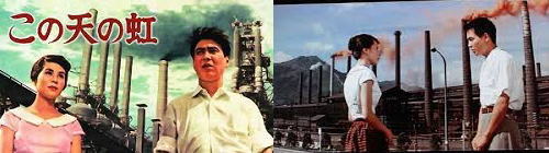 | 登は明るい夢見がちな青年だったが、彼の友人で苦学を続けている三井は、登の言葉を信ぜず、現実の生活に絶望していた。登の家、森田屋は川崎市で酒屋を営んでいるが、生活は楽ではなかった。ひろ子は森田屋の主人良一の許に嫁いで来たばかりだが、戦災で足が不自由になり、婚期を逸した義妹泰子や良一の義理の母しげの間でつらい立場にあった。職を探しに上京したひろ子の幼友達の信吉が、帰郷の前にひろ子を訪れた時、しげと泰子はひろ子と信吉の事を色々と臆測し、ひろ子の心は激しく動揺した。しかし良一のやさしい理解のある態度に、ひろ子は必ず良一と幸せな家庭を築こうと心に誓った。泰子は足が不自由という劣等感、彼女から去って行った愛人に対する憎しみ、片輪者どうしを一緒にしようとする周囲の人々の態度等によって、冷たい、かたくなな性格になっていたが、森田屋の昔の使用人俊どんが泰子の足が不自由になった今でも昔と変らぬ愛情を持っているのを知ると、俊どんの故郷、赤石山麓に住み一緒に幸福を得たいと願った。泰子の希望を取り戻した明るい手紙を読み、またひろ子の心情を知ったしげは、次第にかたくなな心を解き、登の家には明るい笑顔がみられるようになった。 | 北九州の一角、東洋最大の八幡製鉄所では、今日も鉄と人間が火花を散らして戦っている。縦横に走る構内鉄道、その運輸部ポイント返しの若い作業員須田菊夫は、熔鉱炉の組長影山の社員アパートに下宿している。ある日、影山の一人息子稔が帰って来た。稔はかって優秀な学生であったが八幡製鉄所の体格規定に外れて、入社出来ず、それ以来ヤケになり会社をやめて家に帰って来たのだ。菊夫が兄の如く慕う熔炉工場の捧心相良は、親和会でフト知り合った女性に心を惹れていた。厚板工場の伍長帯田の娘で、秘書課の事務員千恵である。相良は田舎から母を呼び、影山を仲介にして帯田家に交渉してもらった。帯田家では妻のたつ江が、作業員は夫と息子で沢山だと反対した。息子の京一郎はストリップ工場の作業員で、病院の看護婦平野八重子という恋人がいた。京一郎は相良に好意をもっていた。しかし千恵にも建築技師の町村という恋人がいた。彼は八重子の叔父で渉外課勤務の前川の家に下宿していた。前川の妻久子もいつしか町村に想いを寄せていた。菊夫は製鉄所の音楽会に来た町村と千恵の睦じい様子をみて不安だった。その頃、影山の家に千恵の母が相良との縁談を断りに来た。相良は失望し、それを聞いた菊夫は自分のことのように憤然として、たつ江に談判しに出かけた。たつ江は娘を作業員にはやれぬと一蹴した。翌日、千恵は町村のブラジル派遣と久子との仲が怪しいという噂を聞いた。同じ頃、町村は上司の園部部長から姪の博子との見合を頼まれた。怪我をした京一郎を見舞った帰り、千恵は酔った菊夫と会った。菊夫は相良が作業員だから断ったのかと彼女に詰問した。二人は相良を加えて話をすることにした。その夜、稔は両親の温い眼に見守られながら、再び家を出た。相良は菊夫に千恵と会うようにすすめたが断った。仕方なく菊夫は一人で千恵に会った。千恵は決して相良を作業員だから断ったのではなく、すでに町村という人がいたからだ、と真意を話した。菊夫は千恵の本心を聞き、なにか心が軽くなり、二人で製鉄所をみおろせる高炉台公園に行った。ある日、菊夫は列車から飛び降りそこなって怪我をした。彼の熱意は相良を千恵に会わせた。千恵は相良の人柄を今さらながら見直した。しかし町村からの求婚でブラジルに行く決心をした。高炉台公園で立昇る虹のような製鉄所の煙をみながら相良と千恵はお互の幸福を祈るのであった。 | ||||||||||||||||||||||||||||