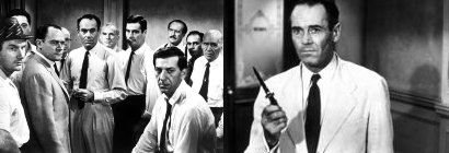 ニューヨークの法廷で殺人事件の審理が終わった。被告は17歳の少年で、日頃から不良といわれ、飛び出しナイフで実父を殺した容疑だった。12人の陪審員が評決のため陪審室に引きあげてきた。夏の暑い日で彼らは疲れきっており、早く評決を済ませ家に帰りたがっていた。第1回の評決は11対1で有罪が圧倒的、しかし、判決は全員一致でなければならなかった。無罪は第8番(ヘンリー・フォンダ)ただ1人。彼は不幸な少年の身の上に同情し、犯人かもしれないが有罪の証拠がないといった。第3番(リー・J・コッブ)が証拠を読みあげた。殺人の行われた部屋の真下に住む老人が、当日の夜、少年が“殺してやる!”と叫んだのを聞いた。その直後、老人は少年を廊下でみかけた。警察は被害者の胸に飛び出しナイフが刺っているのを発見した。逮捕された少年はその時間に映画を見ていたという。だがその題名は思い出せなかった。第10番(エド・ベグリー)は殺人現場の向う側に、高架鉄道をはさんで住んでいる老婦人が、折から通過した回送電車の窓越しに、犯行を目撃した事実を指摘した。第6番(エドワード・バインス)は親子の仲が日頃から悪いことを重要視した。これに対し第8番はこれらの証言にも、万が一間違いがあるかもしれないと反駁した。陪審員たちは凶器のナイフを再検討した。被告はナイフを買ったことは認めたが、落としてなくしたという。警察は形が特別なもので、被告のものが凶器だと主張した。第8番は同形のナイフを自分のポケットから取り出した。この効果はあった。2度目の評決で第9番目(ジョセフ・スウィニー)が無罪に変わった。味方を得た第8番は、証言の不確かさを次々と反駁していった。第11番(ジョージ・ヴォスコヴェク)は少年が犯人なら、なぜ捕まるとわかっている自宅に帰ったのかと疑った。3回目の評決がとられた。無罪が4人に増えた。第2番(ジョン・フィードラー)が傷口のことにふれた。第5番(ジャック・クラグマン)は飛び出しナイフなら傷口の角度が逆だという。第8番の科学的な分析と、粘り強い説得で、第7番(ジャック・ウォーデン)、第1番(マーティン・バルサム)と第12番(ロバート・ウェバー)が無罪の側についた。いまだに有罪を主張するのは頑固な第3番と、第4番(E・G・マーシャル)と狂信的な第10番だけ。その時、第9番は第4番のかけている眼鏡から思いつき、証人の女が近眼で、彼女の証言が嘘だと指摘した。有罪は第3番だけになった。彼は自分の意見を述べた。が、論旨は通らず遂に自分の敗北を認めた。評決は全員一致で無罪となった。外に出た12人は、互いの名前も知らずに、夕立のやんだ街の中へと散っていった。