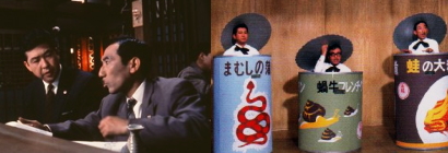 | 太陽食料社長三沢英之助が今、力こぶを入れているのは、新製品のまむし、蛙、かたつむりの罐詰の売出し。その三沢が大阪へ出張することになった。随行をおおせつかったのはコチコチ社員の桑原。社長の旅先の浮気を封ずるボディガードとして彼が選ばれたわけだ。桑原はその融通のなさでは定評があり、同期の中では一番出世がおくれている。医務室の彼の恋人松浦敬子はそれが大変くやしい。さて二人はいよいよ出発した。三沢社長は車中で早速美人を見つけてちょっかいを出しかけたり、バーのマダムを大阪に呼び出したりする。大阪に着いた三沢は、支社長の土井から最近の我社が競争相手に押されているという報告を聞いて大変驚いた。早速まき返し作戦がはじまる。だが浮気の虫はまた別である。汽車の中の美人芸者をつれ出した三沢は、土井に桑原をまかせてこきげんのナイトクラブめぐり。だがそこでバッタリと会ったのは桑原随行員。酔いつぶすはずの土井の方が、反対にぐでんぐでんの始末であった。舞台は白浜温泉へ飛んだ。三沢は海外にも販売網を持つ南海物産の本田の接待に大ふんとう。だが本田のごきげんは斜めだった。その夜バーのマダムが東京からやって来た。ほくそ笑んだ三沢は強壮剤をのみして待ちかまえる。ところがそれは桑原の持って来た睡眠薬で、二人がそれぞれまちがえたからひと騒動。昼すぎになっても起きない社長を心配して、東京から社長夫人と敬子が現れた。桑原は敬子に美人芸者との仲を疑われてしまう。翌朝ゴルフ場で本田に会った三沢は、まむしの罐詰おかげでホールインワンに成功した本田と契約を結ぶことに成功する。敬子にむくれられてくさった桑原は、三沢の道中記を夫人に告げると彼をおどし、敬子との仲人を約束させたのだった。 | 太陽食料の桑原武は前編での随行さんぶりが認められて秘書課長に抜擢された。三沢社長夫人は、一人娘の幸子の婿にと考えた。命を受けた倉持専務が縁結び運動にのりだした。驚いたのは、医務室の女医で桑原の恋人の敬子である。土井関西支社長が緊急事態の情報をもって上京した。商売仇の日の出食糧が、浜名湖の養鰻場のうなぎを一手に買占める計画に出たというのだ。外国向けうなぎの缶詰の大口注文を受けている太陽食料には大ショックの報だ。三沢社長、土井支社長、随行の桑原の三人は早速名古屋にとんだ。三沢社長は銀座のバーのマダムえみ子に連絡して。途中、百子という女に財布をスられたりの災難にあい、ようやく浜名養鰻の近藤社長の自宅を訪れた。近藤社長はのらりくらりのうなぎ姿勢。ゴウをにやした三沢社長は土地の芸者を総動員してご接待。だが、近藤社長夫人の妹で売れっ子芸者〆丸が桑原と意気投合てコップ酒の飲みくらべを始め、せっかくの宴会もオジャンになった。東京へ向った近藤社長を追って東京へ戻った三沢社長は、えみ子のバーへ顔を出した。ところがえみ子と近藤社長はただならぬ仲。そこへ、桑原と彼を追ってきた〆丸が顔をみせた。東京での浮気が〆丸に見つかれば浜松の夫人に筒抜けと近藤社長は大あわて。三沢社長のとりもちで無事おさまり、そのかわりうなぎは太陽食料へという契約が成立した。桑原も、社長のとりもちで敬子とハッピー・エンドと相なった。 |