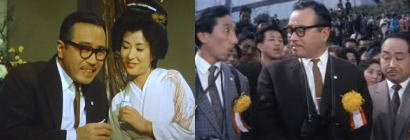 福島電機工業は創立十周年を迎え、関西から初代社長未亡人ヨネと末娘トメ子も列席して、折しも盛大な祝賀会が催されていた。ヨネ未亡人の前に出ると、口も八丁、手も八丁の二代目社長啓太郎も子羊のよう。席上、トメ子が撮影した8ミリ映画が映写された。先代にドナられてペコペコしている啓太郎の惨めな恰好が写し出され、見入る社員達は笑いをこらえるのに苦労するといった有様。そんな中にあって、大場営業部長だけは、先代の姿が出て来ると、こみ上げる涙を押さえることが出来ないといった態である。その様子は、ヨネ未亡人をいたく感激させてしまった。さて、啓太郎は技術提携のため近々渡米する予定である。留守居をさせる厚子夫人のために、彼は休日の一日位は同伴で買物に出掛けねばならない。彼はこの役を秘書課長の長谷川に命じた。そして自分は止むを得ぬゴルフの大会があると偽って新橋芸者梅千代の許へ参じた。 |