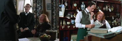 221Bで、ホームズとワトスン、警視庁のレストレード警部が一緒に夜を過ごしていた。何か変わった事件でも抱えているかと尋ねるワトスンに、レストレード警部は奇妙な事件の話を始める。モース・ハドスンで売られていたナポレオンの胸像が何者かに壊された。別の晩にはバーニコット博士の家に置かれていた同じ胸像が盗まれて玄関先で壊され、同じ夜に外科医院の胸像も壊されていた。そのどちらもハドスンの店で購入したナポレオンの胸像だという。ワトスンは固定観念に取り憑かれたアンチ・ナポレオンの犯行だと論じるが、話を聞いたホームズは、進展でもあれば連絡をくれとレストレードに頼む。後日、中央共同通信社のホリス・ハーカー邸でもナポレオンの胸像が壊されるが、玄関先で死体が発見される殺人事件にまで発展してしまった。レストレード警部と捜査を競い合うことになったホームズは、モース・ハドスンの店で仕入れ先を尋ねると、ゲルダー商会を教えられる。ゲルダー商会に赴き、支配人に遺留品の写真を見せると、イタリア人のベッポで、かつてここで腕の良い職人として働いていたが、同じイタリア人を決闘の際に刺してしまい、服役中だという。ホームズは11日前にベッポが釈放されたと睨んだ。ベーカー街に戻ると、レストレード警部が一足先に221Bにやって来ていて捜査の進展を述べる。被害者の身元を突き止めたのでイタリア街に出向き犯人を逮捕する予定だと話すと、ホームズはチヂックに行こうと誘った。 |