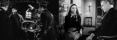 | 第2次大戦下のビルマ・タイ国境近くにある日本軍捕虜収容所。所長の斎藤大佐(早川雪洲)は教養の深い武人だった。ここに収容されているアメリカの海軍少佐シアーズ(ウィリアム・ホールデン)らは激しい労役に脱出の機会を狙っていたが、そんなある日、収容所にニコルスン大佐(アレック・ギネス)を隊長とする英軍捕虜の一隊が送られてきた。バンコック・ラングーン間を結ぶ泰緬鉄道を貫通させるためクライ河に橋梁を建設せよとの命が司令部から斎藤大佐に下り、その労役に送られてきた捕虜である。橋梁完成期日は5月12日、日は幾ばくもない。斎藤大佐は捕虜全員に労役を命じた。が、ニコルスン大佐はジュネーブ協定に背反すると将校の労役従事を拒否したため、営倉に監禁された。その夜シアーズは仲間2人と脱走し、1人だけ助かってコロンボの英軍病院に収容された。一方、収容所では担当者の三浦中尉の工事指導が拙劣なためと捕虜のサボタージュのため架橋工事が遅れていた。斎藤大佐は焦慮の余りニコルスンら将校の翻意を促したが彼らは応じない。やがて3月10日、陸軍記念日となった。斎藤大佐はニコルスンらの頑固さに負け、彼らの恩赦を伝えた。ところがこのとき、意外にもニコルスンは自ら架橋工事に当ろうと申し出た。彼は、サボタージュが軍紀の弛みだとみて捕虜たちに建設の喜びを与えることによって本来の軍人の姿へ鍛え直そうと考えたのである。そして架橋方法にも積極的な意見を述べた。架橋の主導権はニコルスンに移った。期日までに橋を完成するために、斎藤大佐はあえてその屈辱に甘んじた。その頃英軍病院にいるシアーズのもとにワーデン(ジャック・ホーキンズ)という英軍少佐が訪れ、意外な申し入れをした。バンコックーラングーン間の橋が完成、鉄道が敷かれれば日本軍はインドへ迫るだろうし、それを阻止するためには落下傘で挺身隊を降下させ橋を爆破するより方法がない。シアーズに道案内を頼む、というのである。シアーズは、ワーデンの説得を承知した。ワーデン、チャップマン、ジョイス、シアーズの4人からなる橋梁爆破挺身隊は輸送機からタイの密林地帯に降下した。この時チャップマンは巨木に激突、落命した。残る3人は難行軍を続けた。携帯ラジオで、橋は5月12日に完成、13日には初列車がクワイ河を渡るとの日本軍の情報を知った。事実、クワイ河の架橋工事は進み、捕虜兵士の士気は上がり、彼らは橋梁建設に生きる意義を見出していた。ニコルスンはこの橋に英軍の誇りをかけていた。5月12日がきた、夕刻、ワーデンら挺身隊はクワイ河を見下ろす陸の上に辿りついた。夕陽に映えて巨大な橋が見事完成されていた。夜影に乗じ、ジョイスは橋脚に爆薬を装置、シアーズとワーデンは迫撃砲を備えて彼を援護、橋梁爆破の準備はなった。朝がきた。斎藤大佐とニコルスンは最後の点検にと橋を上へ上った。そのとき、ニコルスンは橋脚の爆薬を発見した。と、その矢先斎藤大佐はジョイスに後から刺し殺された。折しも列車の汽笛が聞こえた。ジョイスは発火装置に迫ろうとしたがニコルスンに遮られた。シアーズがジョイスを助けるため出てきたがジョイスとともに、日本兵に射殺された。その瞬間、丘の上のワーデンが放った迫撃砲の1弾はニコルスンの傍らに落下、ニコルスンの体は発火装置の上に崩折れた。捕虜たちが苦心の末に完成した橋は列車とともに粉砕した。ゆるやかに流れるクワイ河の水面に、「本橋梁は英軍将士によって建造されたものなり」と書いた1枚の板が漂うばかり……。 | ナポレオン3世が第2帝政を布いていた頃のフランス。スペインの国境に近いピレネー山中の寒村ルードに、スウピルウという貧しい夫婦がいた。貧乏者の子沢山のことわざ通り妻のルイズは5人の子供を産んで生計はいよいよ苦しかった。ベルナデットはその長女であった。装い飾るわけではないのに天成の麗わしさにね界わいきっての美人の評判がたかかったが、惜しいかな健康に恵まれなかった。身体が弱いためか信仰心があつく、いつか彼女は聖霊ちを幻想するようになった。正直なベルナデットはそれを伯母に打ち明けると、伝え聞いた意地悪のジャンヌは散々嘲笑するのであった。そんな事でベルナデットの信仰が搖ぐものではなく、彼女は暇さえあればお祈りをしていた。ある日彼女は村はずれの洞窟で白衣の聖女の姿を見た。そして洞窟にわいている泉の水は、信仰篤い者の病を医するであろうというお告げを聞いた。ベルナデットはその帰る途中異常の興奮のせいか病身にこたえたのか路傍に倒れた。かねてベルナデットの美しさに心ひかれていた若者アントアン・ニコロオの家まで運んだ。洞窟の霊泉が死にかけていた1人の赤児を救ったといううわさが飛ぶと、近郷近在の善男善女が伝え聞いて、ルールドの村に集まって来た。しかしこの奇跡を識者は去って信じなかった。尼僧ヴォーズウさえ信じない。ルールドの警察署長長ヂャコメ