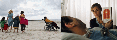 | 病室で意識を取り戻したジャン=ドミニク・ボビー、通称ジャン=ドー(マチュー・アマルリック)は、自分が倒れ、昏睡から目覚めたのだと理解する。しかし自分の言葉が誰にも伝わらず、身体がまったく動かないことに気づく。主治医は、全身が麻痺する「ロックト・インシンドローム」であると告げる。唯一動くのは左目だけだった。かつての彼は「ELLE」誌の編集者として華やかな世界で働き、女性関係も忙しく、3人の子供にも恵まれていた。ジャン=ドーは、そのころとは掛け離れた現実を、潜水服に閉じ込められたように感じた。言語療法士のアンリエット(マリー=ジョゼ・クローズ)は、左目を使ったコミュニケーションの手段を発明する。「はい」なら1回、「いいえ」なら2回瞬きをするというものだ。使用頻度の高い順に並べられたアルファベットを読み上げていき、ジャン=ドーが左目で合図する。そうして文章を作ることで、蝶が自由に舞うように、記憶と想像力で自分もどこへでも行けると気づいたジャン=ドーは、生きる気力を取り戻す。ある日、編集者のクロード(アンヌ・コンシニ)が彼を訪ねる。ジャン=ドーは倒れる前に、本を執筆する契約を結んでいた。クロードは日々、ジャン=ドーが左目の瞬きで綴る文章を記録していく。それは彼の半生であり、父の記憶や、恋人ジョゼフィーヌと行ったルルドの記憶だった。ジャン=ドーが過去を旅する間も、父が誕生日に祝いの電話を掛けてくれたり、3人の子供とその母セリーヌ(エマニュエル・セニエ)が病室を訪ねて来たりした。ジャン=ドーは改めて周囲の人々に感謝の気持ちを抱き、その思いも本に綴る。理学療法士マリー(オラツ・ロペス・ヘルメンディア)とのリハビリで首や舌も動かせるようになり、父の日には家族で海に遊びに行くことができた。ジャン=ドーは快復の希望を胸に、執筆を続けるのだった……。 |