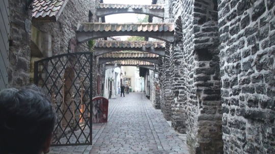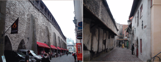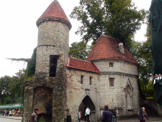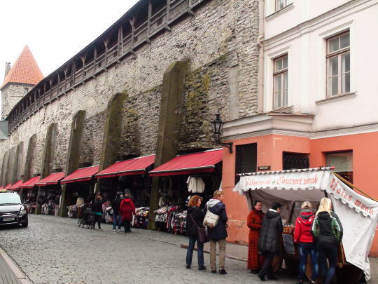 ラエコヤ前広場脇の路地裏には沢山の商店が軒を連ねウィンドショッピングも楽しい。市庁舎前広場はパステルカラーのハンザ商人の屋敷跡やカフェに囲まれとても美しい。今日の観光を終えてホテルへ戻ることにする。 広場からヴィル通りを下るとセーターの壁といって城壁下にセーター屋さんが並んで店を構えている。その先のヴィル門を抜けホテルへ戻る。 |