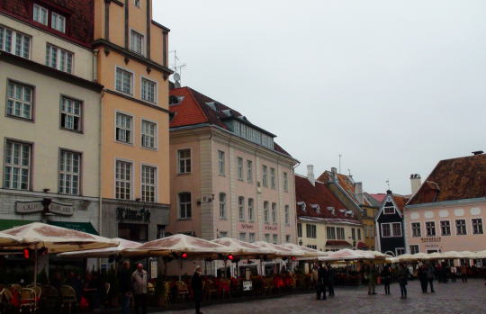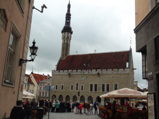 のっぽのヘルマンから下に見える公園に行く。エスニアの神話に登場する王妃「リンだの像」があってそこからはトームペア城・のっぽのヘルマンの全景が見ることが出来る。下は観光バスの発着場になっていてぞくぞくとバスが到着して団体客を降ろして賑やかだ。 お城の裏道から石畳の坂道を下るとタリンの中心:ラエコヤ前広場(市庁舎前広場)に出る。 ラエコヤ広場はタリンのランドマークで全ての観光客が集まってくる。 広場を取り囲む建物はパステルカラーのハンザ商人の屋敷跡でその前をカフェに囲まれた広場はとても美しい。 |