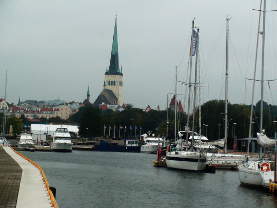 3日目タリン最終日 昨夜は疲れて9:00頃寝て夜中何度も目が覚める。体力の衰えをつくづく感ずる。 ラジオ体操。朝食後10:00~世界遺産の街タリンも今日一日。昨日見残した所を歩く。ホテルからタリン港へ。この港からはフィンランド・ヘルシンキやロシア・サンクトペテルブルクへフェリーが発着している。港から城壁の端に建つ聖オレフ教会の尖塔が見える。 |