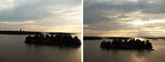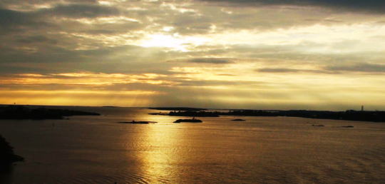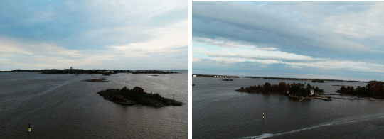 出航に合わせるように夕陽が輝く中を、ヘルシンキの街が寂しく遠ざかっていく。左右に小さな島々が海に浮かんでいるその間をゆっくりと悠然と進んでいく。 |