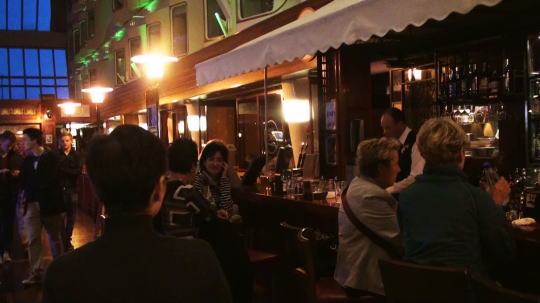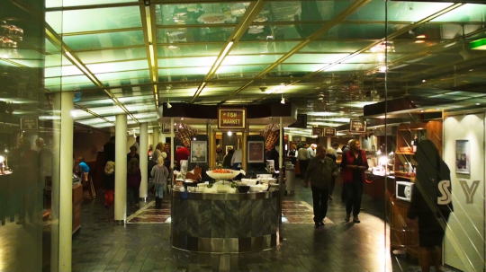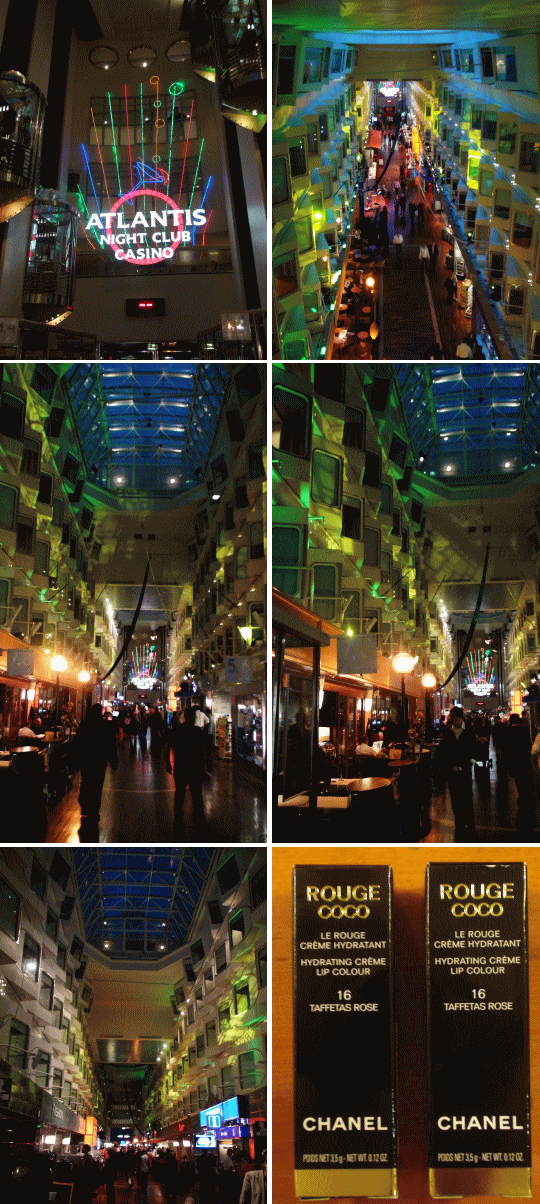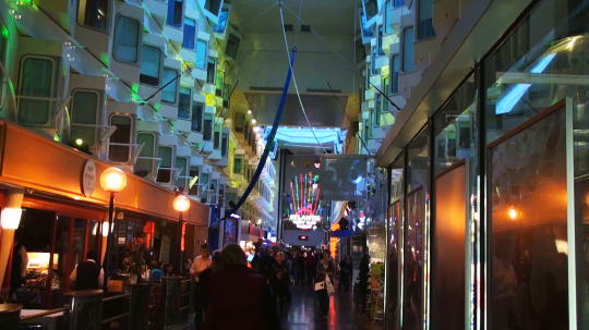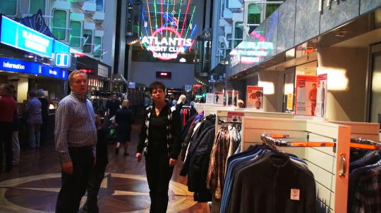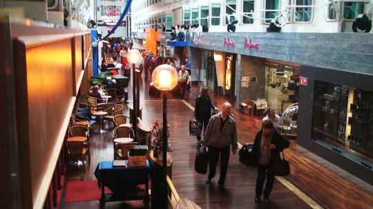乗船した時のカルテットが笑顔いっぱいに演奏を続けている。化粧品屋さんに入り日本で買うよりだいぶ安いとMが口紅を2本購入(国際航路なのでTaxFree)。プロムナードにはナイトクラブ、ゲームコーナー、カジノ、パブ、レストランも4~5つあり、お祭りのような賑やかさ。 |