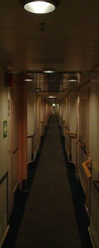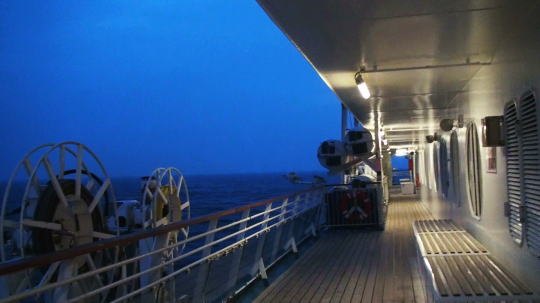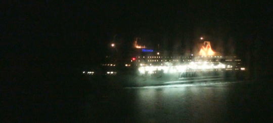 船内は夜遅くまで賑やかで、下のクラブでは深夜まで音楽が止まなかった。その賑やかさはお祭りのようで全然気にならず、窓から時々行き交う船の通る、暗い海をしばらく眺めてベッドに入る。 |