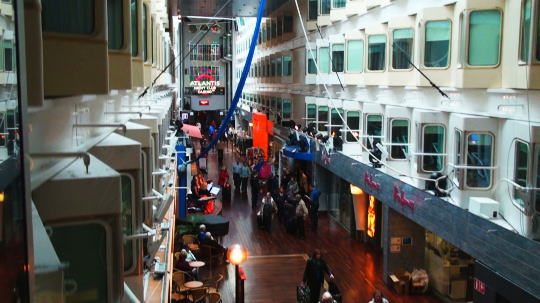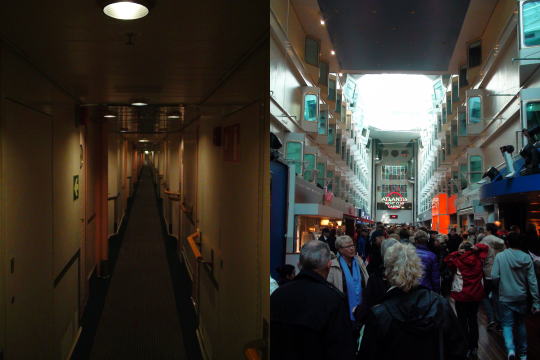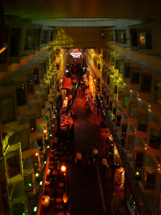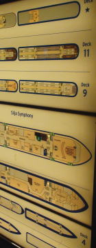 荷物を置いてすぐに6階におりレストランでディナーの席を予約する。 17時の出航までだいぶ時間があり艦内を見学する。下におりるとまだ乗船する乗船客の長い列が続いていた。 エレベーターから見る船内は船の中と思えない。 華やかで心が子供のように高揚している。僅かな空間でも客を楽しませる演出は日本人にはまね出来ないと思う。 |