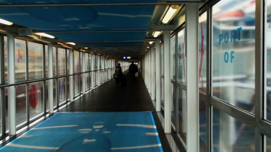 | 3時、チケット窓口で予約票を見せチケットを受け取り、一番最初に改札口に並ぶと、すぐに後ろにぞくぞくと行列ができる。15時半チケット読取り機前に係員が並びランプがつくといよいよ入場が始る。 チケットを読取り機にかざすと鉄のバーが回転して一人だけ通れるようになって次々に入っていく。 乗船口へは長が~い連絡通路を進む。 |