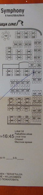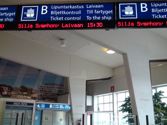 ヘルシンキホテルで預けた荷物を受取りフェリーターミナルに向かう。 エスプラナーディ通りからオリンピアターミナルへ14時半に到着。特大のロビーはまだ人がまばら、窓から船をまん前に見る奥のソファーに腰掛ける。出航準備中の船は近くから見ると巨大な姿で映画の『タイタニック』号を連想する。 |