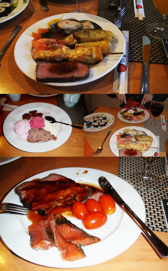 ブッフェなので料理の並んだブースをひと回りしてから大きな取り皿に好みでとるのだが、あまりの種類と量に圧倒されそう。ワインやソフトドリンクも呑み放題でワイン好きのMは大喜び。こんな時下戸な自分は損かな。1皿目はローストビーフなど肉料理から初めて、2皿目は海老やカキなど魚料理、巻き寿司もあり、デザートのケーキ・アイスクリームも膨大な量と種類。横に中国人5名のグループが騒々しく少し気が重かったがマイペースに徹してゆっくり食事する。 |