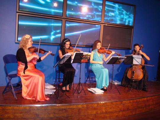 入口には制服姿の男女数名のスタッフが笑顔で向かえ入れる。 その先正面には女性カルテットがウェルカムミュージックの奏でお出迎え。 |