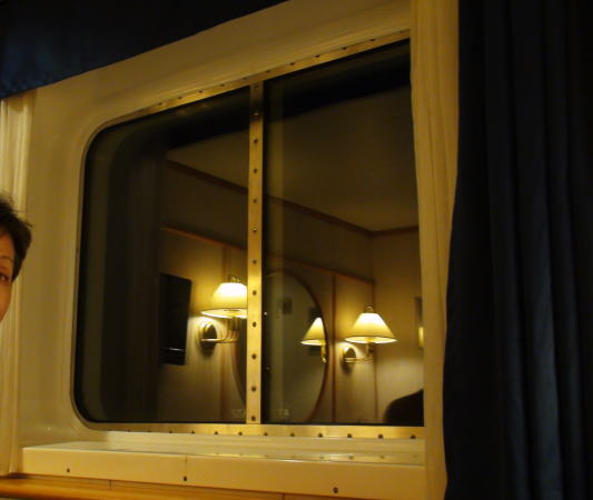 最後に賑やかさを避けて屋上のデッキに上がるとすでに陽は落ちて船の照明だけが暗闇の中に光っていて、また映画のタイタニックを連想してしまう。映画のように立てに沈んだら助かるすべはないだろうなあと思う。風も強く気温は7~8℃くらいだろうかすっかり寒くなって部屋に戻る。揺れはほとんどなくシャワーもコンパクトにうまく作られていて、ホテルのようだ。 |