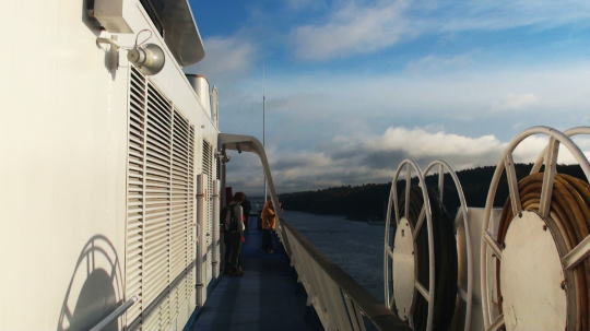17時ぼ~~っと低い音の汽笛がなり、ゆっくり船首が進行方向に向け回転し始める。一番上の展望デッキにあがり少しづつエテラ港から外洋に向けて進む景色を眺める。 |
