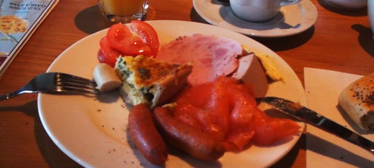 船のベッドはホテルのものと変わらないくらいで、ゆっくり眠れた。5時早く起床・ラジオ体操、天井が低いのでラジオ体操では手が天井に届いてしまう。6:30船内を歩く。プロムナードも屋上デッキもまだ人気がなく静かだ。8時~朝食は部屋のグレード別なので夜と違い静かに食事できた。 |