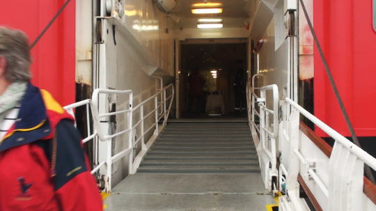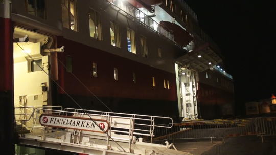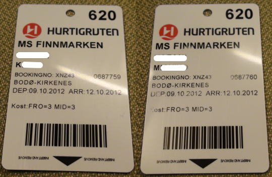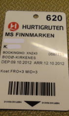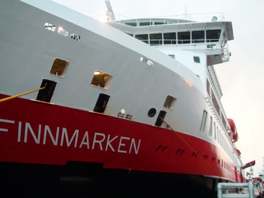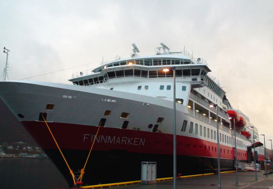 港には船首にFINNMARKENのロゴをつけた大型客船が停泊中。 大きな船体の真ん中に乗船口が口をあけている。 13:00頃やっと入口まで到着して乗船口を入るとスタッフが笑顔迎えてくれる。レセプションは入ると右側にあって、ヴァウチャーを提示してボードー~キルケネスの乗船手続きをする。沿岸急行船は観光客にとっては素晴らしい景色を見ながら進むクルーズシップだが、峻険な土地に住む沿岸住民にとっては大切な交通機関で、100年を超える古き良き伝統と、最新技術が融合している。 |