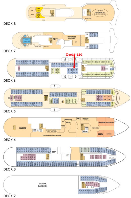 Deck7(7階)はカフェやプールと展望室。 Deck6・5(6・5階)全部キャビン(客室)になっている。 Deck4(4階)はレストラン。ここで朝晩の食事をすることになる。 Deck2・3(2・3階)は客室と駐車場。 |