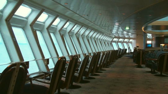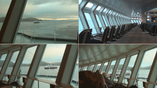 乗船した後、早速船内探検に出かける。 屋上のDeck8(8階)は前方半分はインターネットカフェの周囲をガラス窓前にソファが並び、腰掛けると四方に雄大な北極圏の海景色がひろがっている。Deck8後尾はサウナやフィットネスルームなどがある。 |