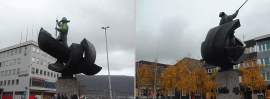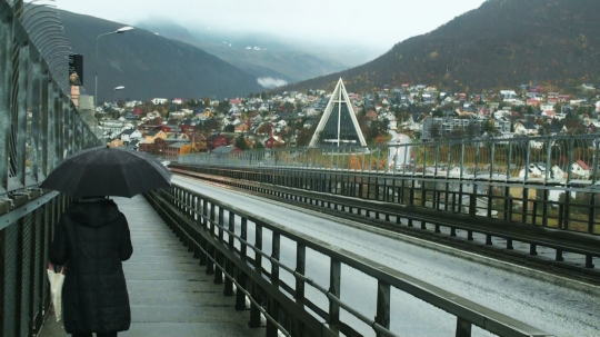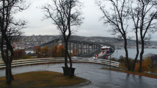 14:30トロムスはノルウェー北部地方の中心都市で、ラップランドの中でムルマンスクに次いで第2の規模の都市。北極圏内に位置しているがメキシコ湾流の影響で同じ緯度の他の地域と比べれば気候は穏やか。学術都市であり、白夜やオーロラといった北極圏特有の自然を体験できる観光地でもある。 出航時間の18:30まで4時間もありゆっくり散策するつもりだったがあいにくの雨。 |