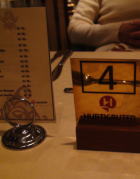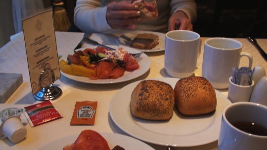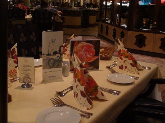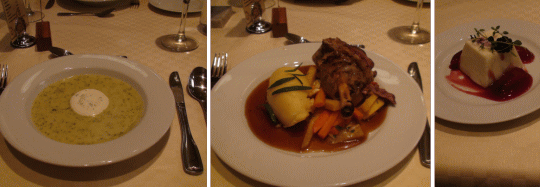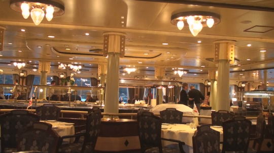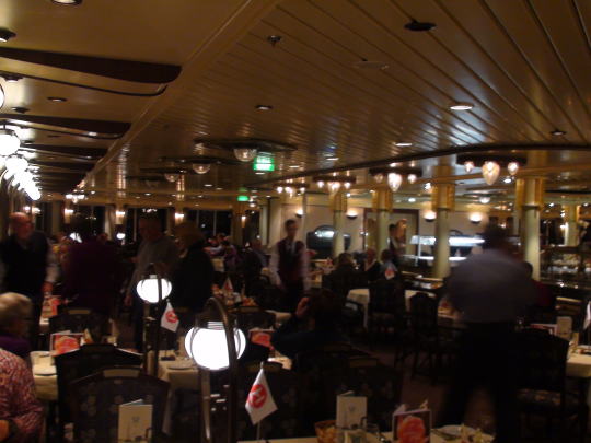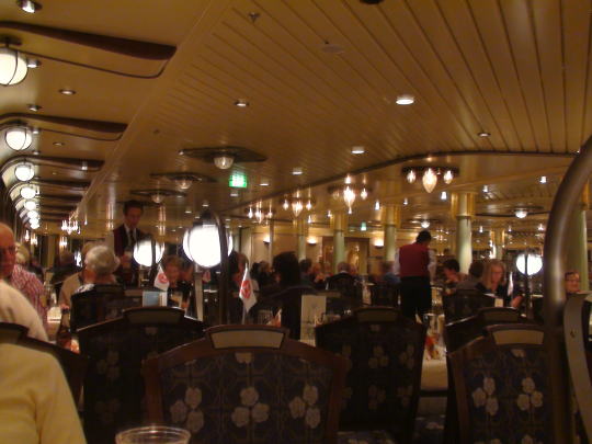 夕食は18:30から4階レストラン。入口受付でキャビンNo.を告げて指定のテーブルへ着席。ウェイターが飲物の注文を受け付けた後料理が運ばれてくる。料理は前菜・魚・肉・デザートと簡単なコースメニュー。 |