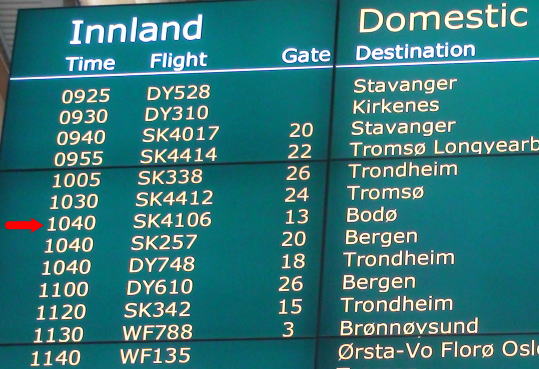 オスロ・ゴーデモエン国際空港からスカンジナビア航空国内線に乗って船旅の出発点、北極圏の町ボードーへ。 オスロ空港13番ゲートで搭乗を待っていると、向かいのベンチに日本人らしい一人旅のご婦人を発見。 Mが話しかけると、やはり日本の方で結婚してチューリッヒに20年暮らしていて、オスロからボードー近郊の村へ観光に行くところだった。 |
