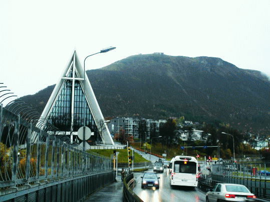 街外れの大通りから約1kmのトロムソ大橋を渡るとノルウェー本土で、渡ったところに北極教会がある。1965年、建築家ヤン・インゲ・ホーヴィにより設計された教会で、ガラスとコンクリートを使い、トロムソの冬とオーロラをモチーフにしてデザインされた教会は実にモダンな造りだ。 |