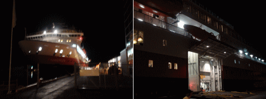 フッティルーテン(沿岸急行船)は料金を毎日チェックしながら5月3日ネットで直接船会社のHP…http://www.hurtigruten.com/から予約した。日本の代理店を通すと手数料が上乗せになったので直予約にした。 沿岸急行船の北行はベルゲン始発でノルウェー沿岸をキルケネスまで7泊8日の航海。 我々の乗船するボードーにはベルゲンを出航して4日目の12時に到着した。 |
