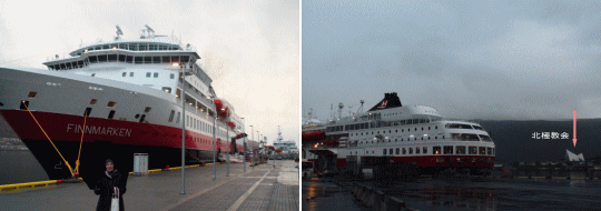 北極教会は夕方4時閉館だったので中は見学できなかったが、教会前の庭から対岸に停泊中のフィンマルケン号がかすんで見えた。はるか向こうに見える船がら1時間くらいでここまで来てしまうのだから人間の足というのはすごいものだ。 |