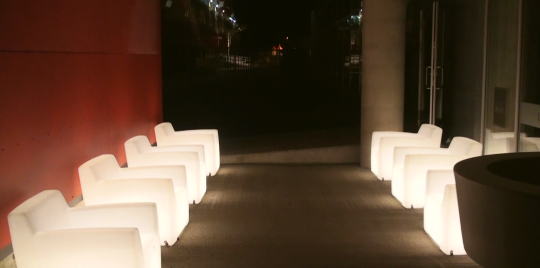 スヴォルヴァール港から街への通り道にあったソファの面白い電飾モニュメント。 夜のスヴォルヴァールはホテルと小さなコンビにの明かりしか人影もなく船の写真を撮ってすぐに船内に戻る。 |