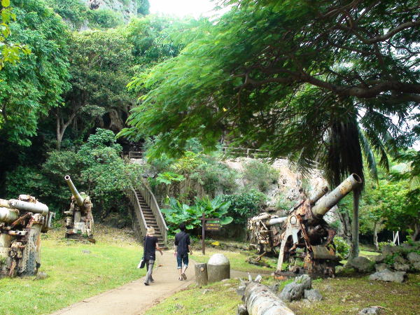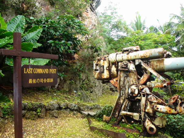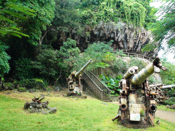 最後の司令部跡に残された日本軍の破壊された武器が風雨にさらされ無残な姿のまま並んでいる。