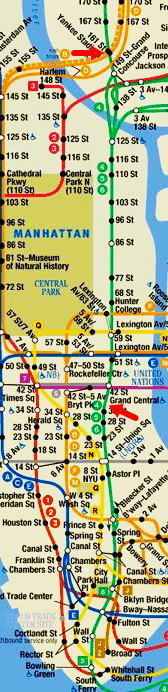 ニューヨーク地下鉄は路線ごとに色分けされているので解り易い。車両の行き先と急行・ローカルなどを見分けながら注意して4号線に乗車する。 |