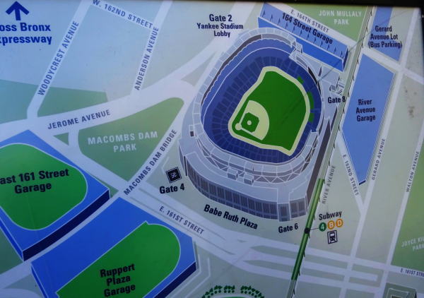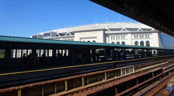 地下鉄4号線161.St(161丁目駅)マンハッタン島の先南側ヒューストン通りが1丁目だからだいぶ北に来ているのがわかる。ヤンキースタジアム駅で降りる。ホームの向こうにスタジアムが目の前。 (ニューヨークではAve街はワンブロック:250b.1丁目はワンブロックだいたい60b) |
