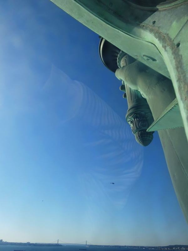 王冠展望台から台座下広場に降りる階段から真上に女神像。女神が立っているやや左側にエリス島とマンハッタン島が見える。 |