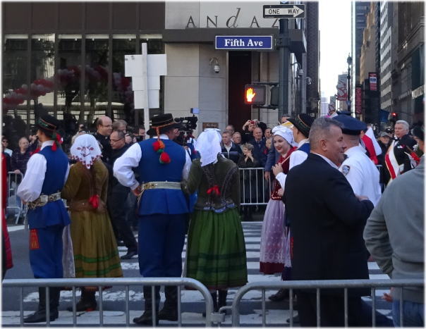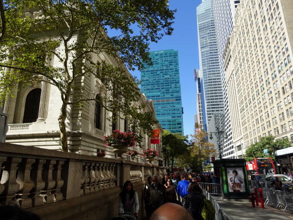 ホテル直ぐ先のニューヨーク市立図書館前に来るとポーランド人らしい記念パレード(白/赤のポーランド国旗)に遭遇しばらく見学する。 |