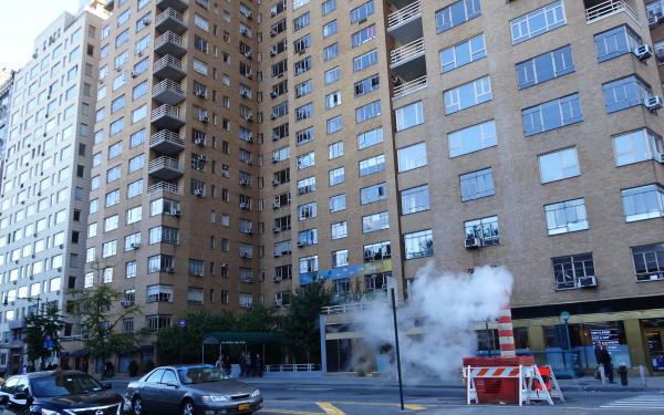『FAO』前の信号待ちしていると前方にニューヨークの風物詩スチームが道路から上がっている。 |