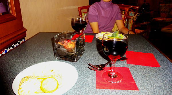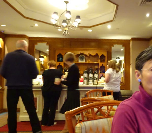 カサブランカホテルでは夕方ハッピーアワーが2階広間であり出かける。満席の盛況で少し待ってテーブルへ。ワイン、シャンペン、お茶、フレッシュジュース、チーズ、クッキー、チョコレート、果物などがカウンターに並び自由にとってテーブルでいただく。ワイン好きのMには天国のよう。広間も映画カサブランカをモチーフにしてるらしくアメリカにいる感じがしない。 |