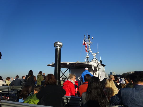 バッテリーパーク・フェリー乗り場が工事中で遠回りしてやっとフェリーを見つけセキュリティチェックを受けて乗船する。あさからトラブルの連続だったがなんとか女神に会いに行く船に間に合った。9:30クラウン(冠部分)チケットを見せて乗船。まだ朝早いのか船はそれほどの混雑はなかった。 |