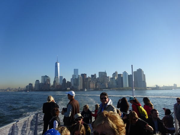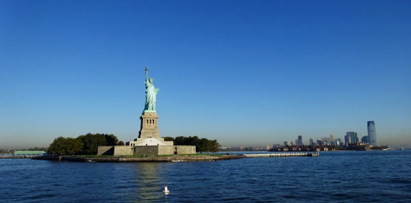 今日も快晴で絶好の見学日和。マンハッタン島を背にして自由の女神のあるリバティ島へ向かって出航する。マンハッタンんのビル群がだんだん遠ざかっていくと前方に自由の女神の像がだんだん大きくなり近づいてくる。 |